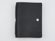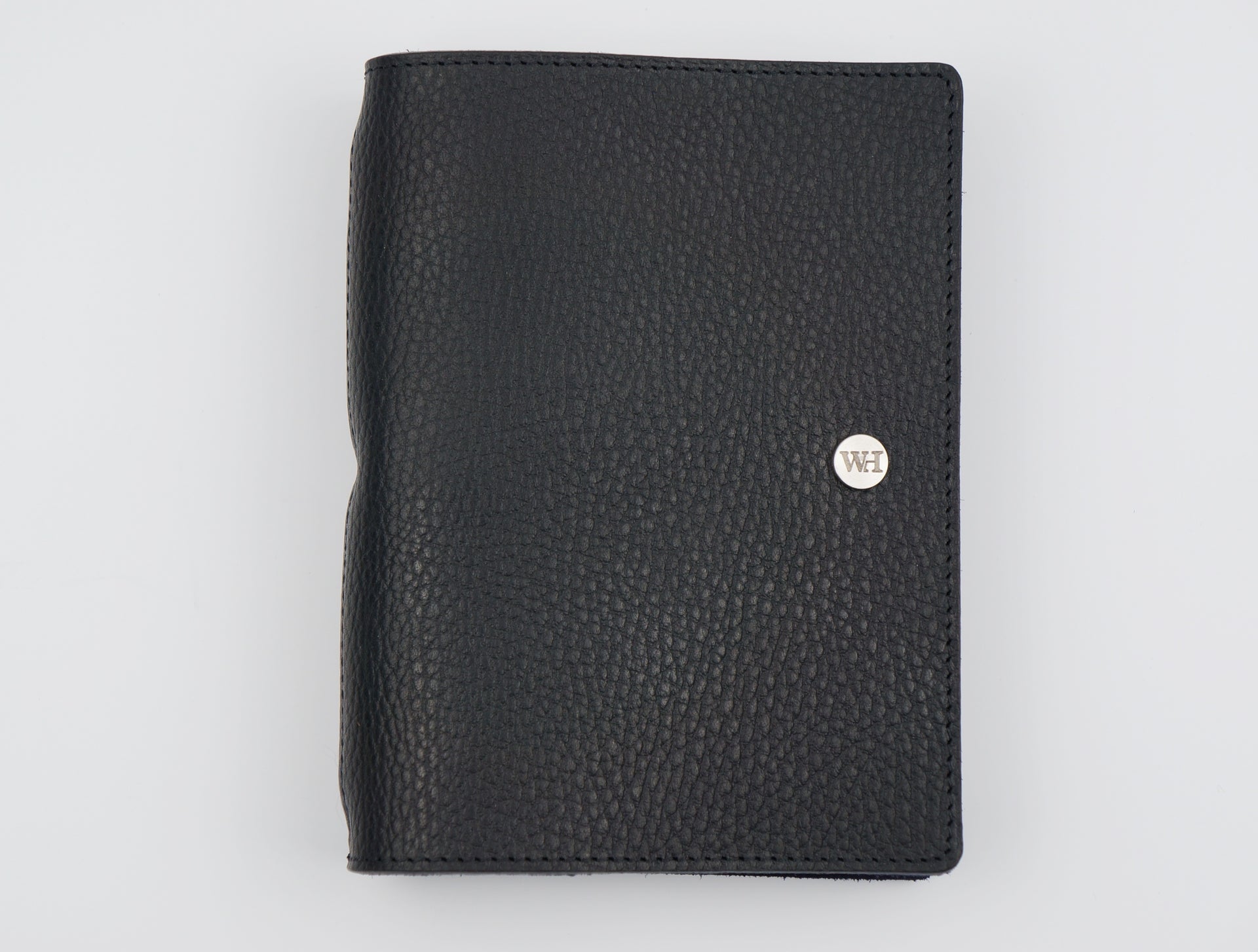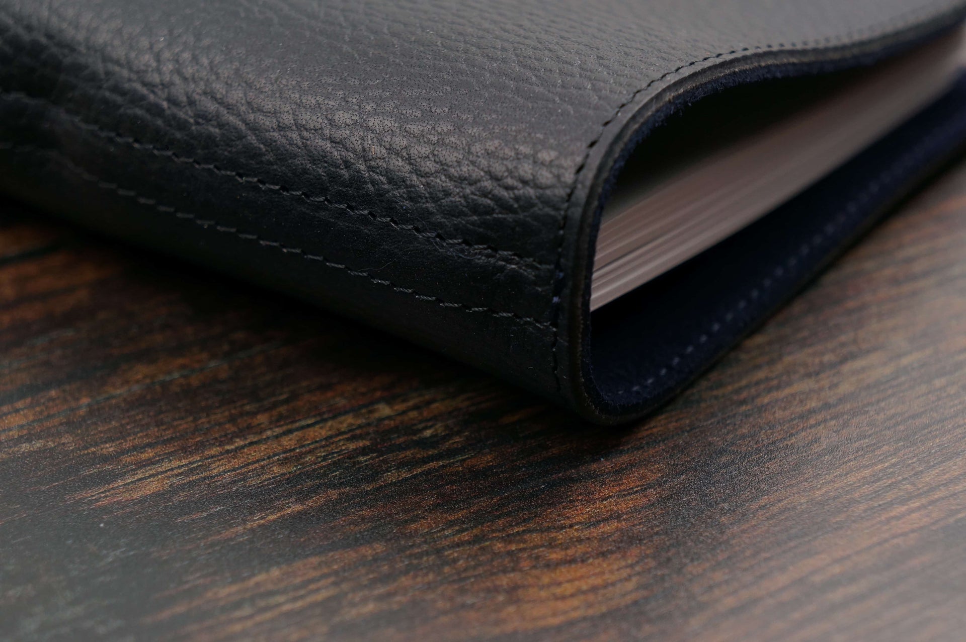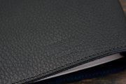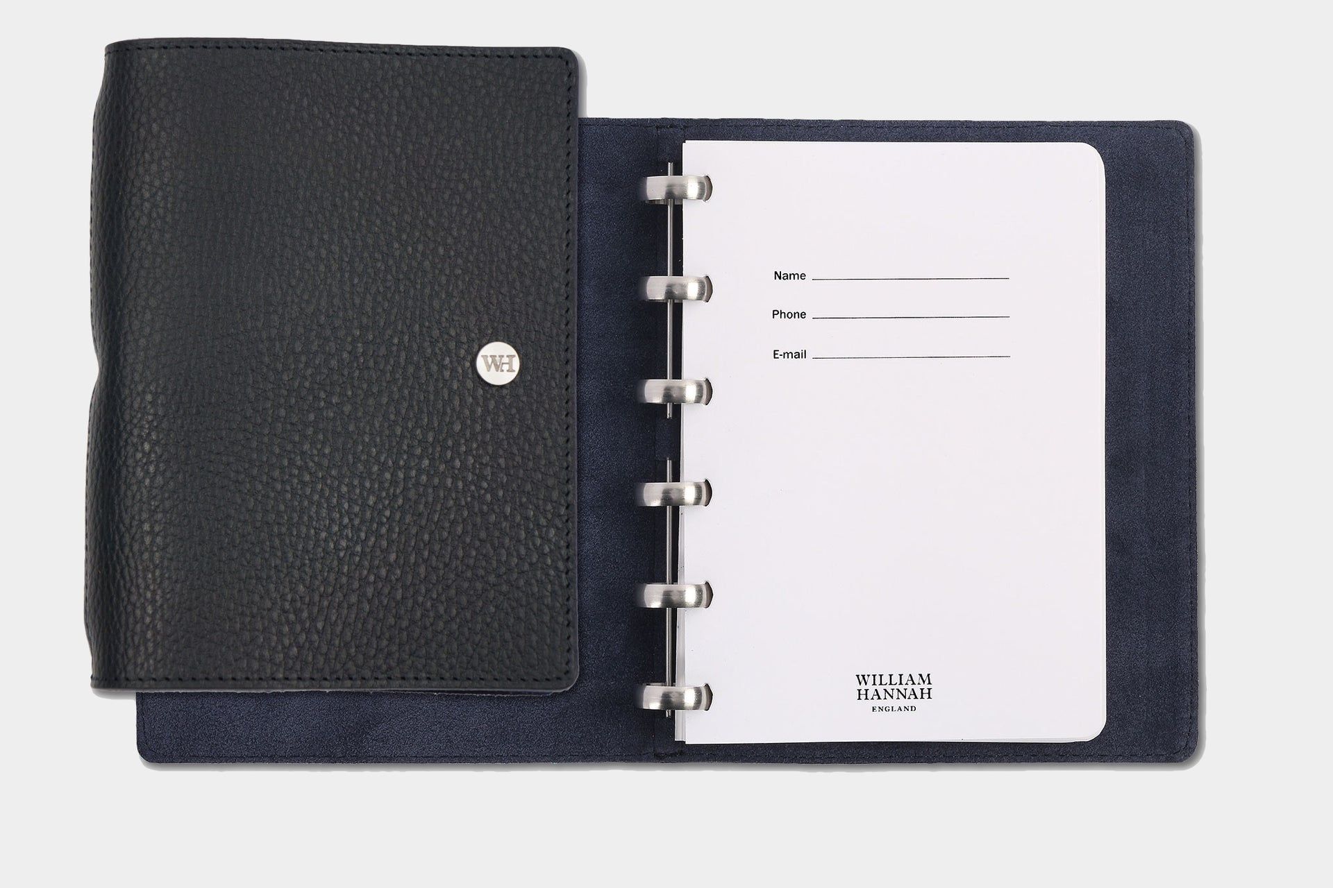 The smaller A6 version of our classic notebook, with a special Textured Black leather outer, a Dark Navy suede inner, and our engineered stainless steel discs.