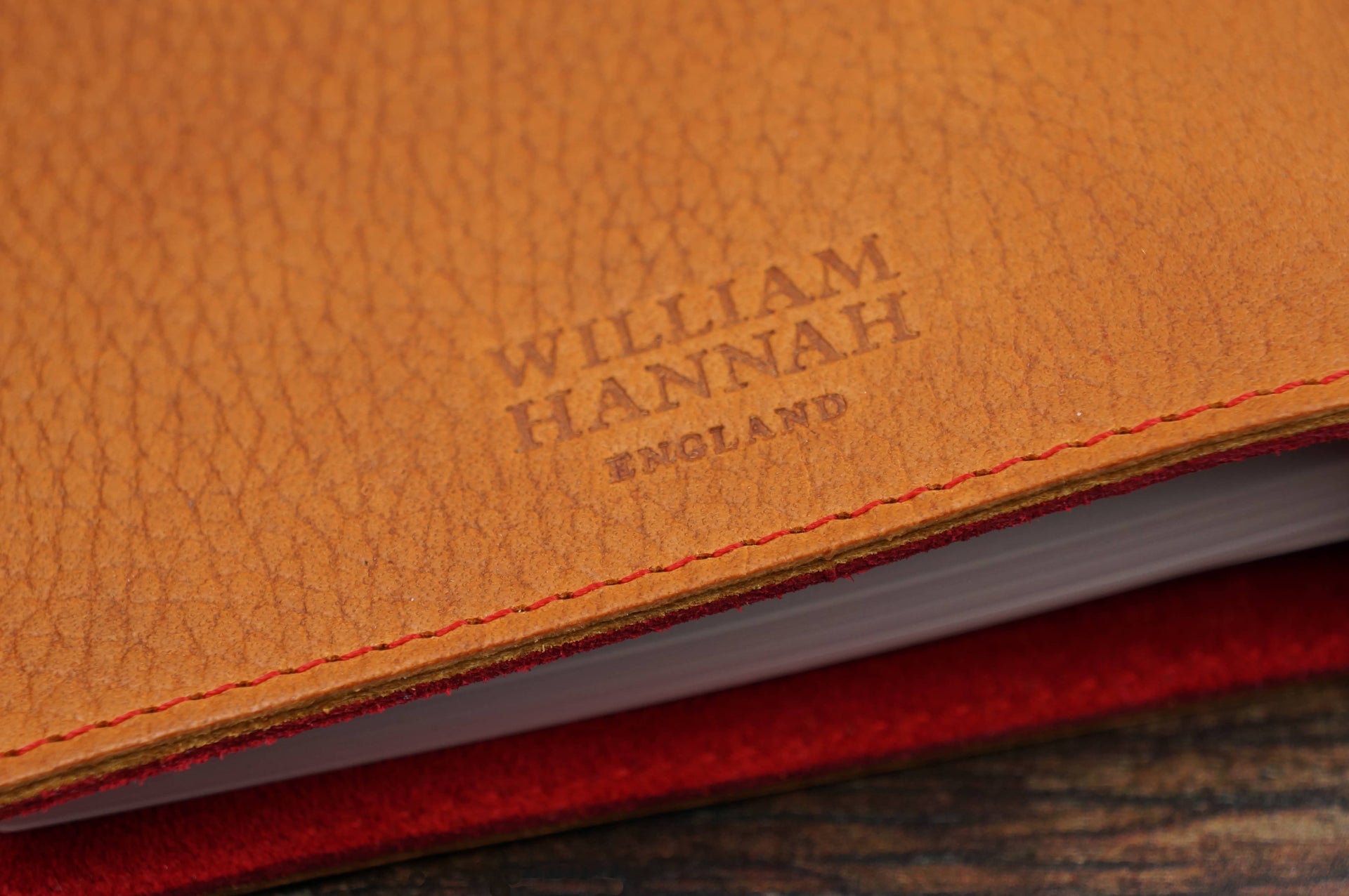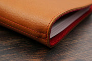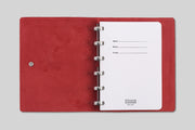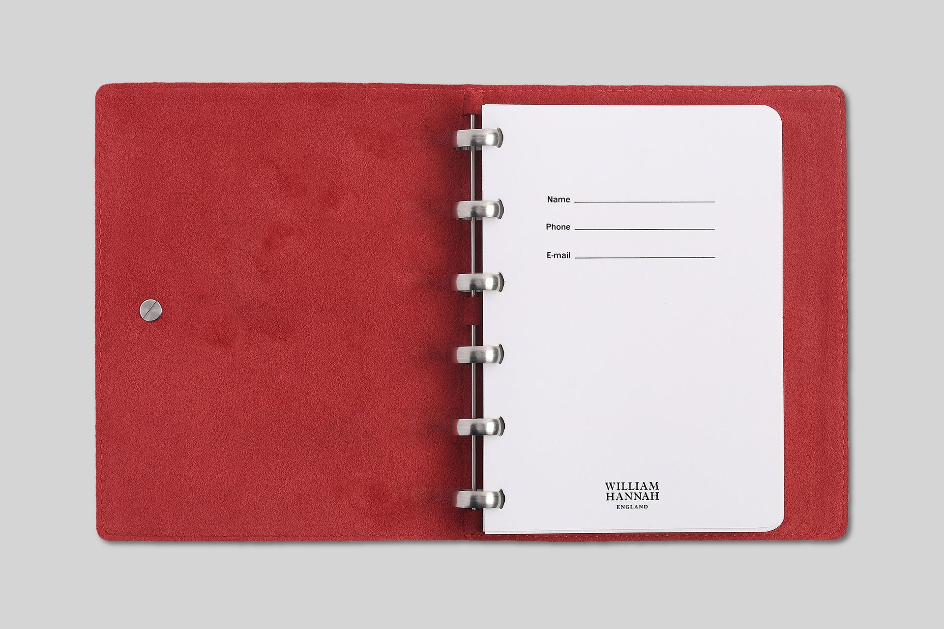 A smaller A6 version of our classic notebook, with our extra soft Tumbled Whiskey leather outer, a Crimson suede inner, Crimson stitching inside and out, and our engineered stainless steel discs.