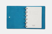 A smaller A6 version of our classic notebook, with a special Textured Dark Navy leather, a stunning Kingfisher suede inner, contrasting Kingfisher outer stitching and engineered stainless steel discs.