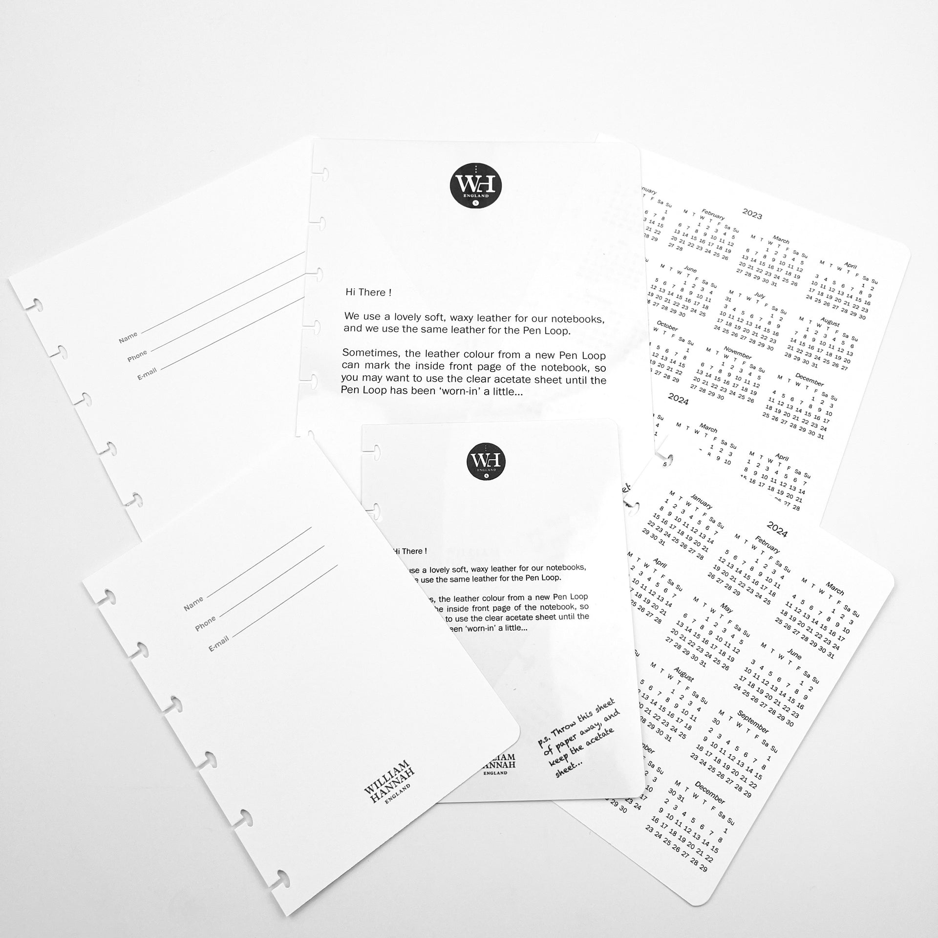 Made from the same luxury English paper stock that we use in the rest of the notebook, but in a thicker 270gsm weight, these replacement front pages, calendar pages and clear sheets allow you to freshen the look of your existing notebook.