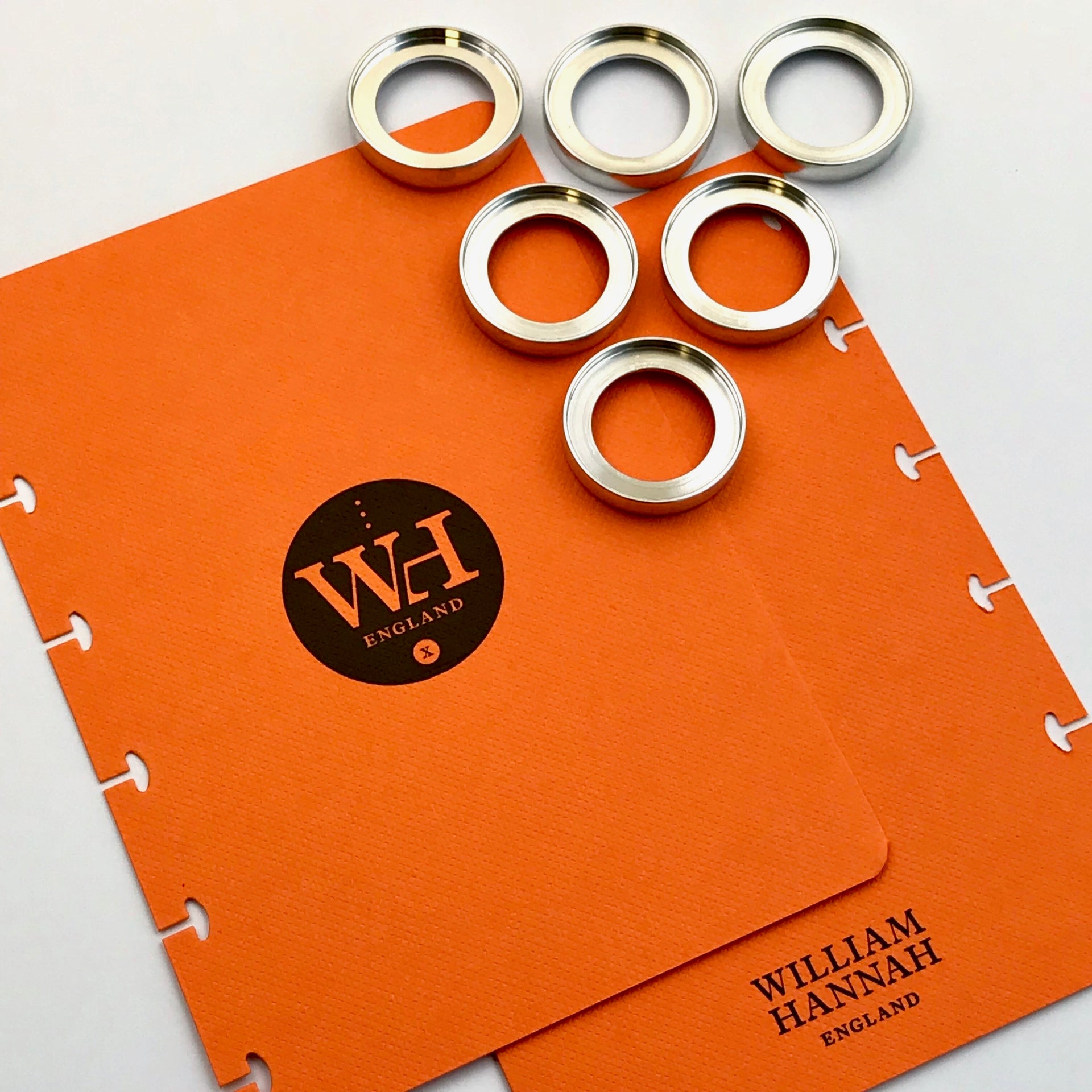 Engineered to the same exacting standards as the steel rings we use in our notebooks, each set of 6 large Aluminium rings will hold over 120 sheets of A6 notes, ideas and thoughts between two luxury card covers.