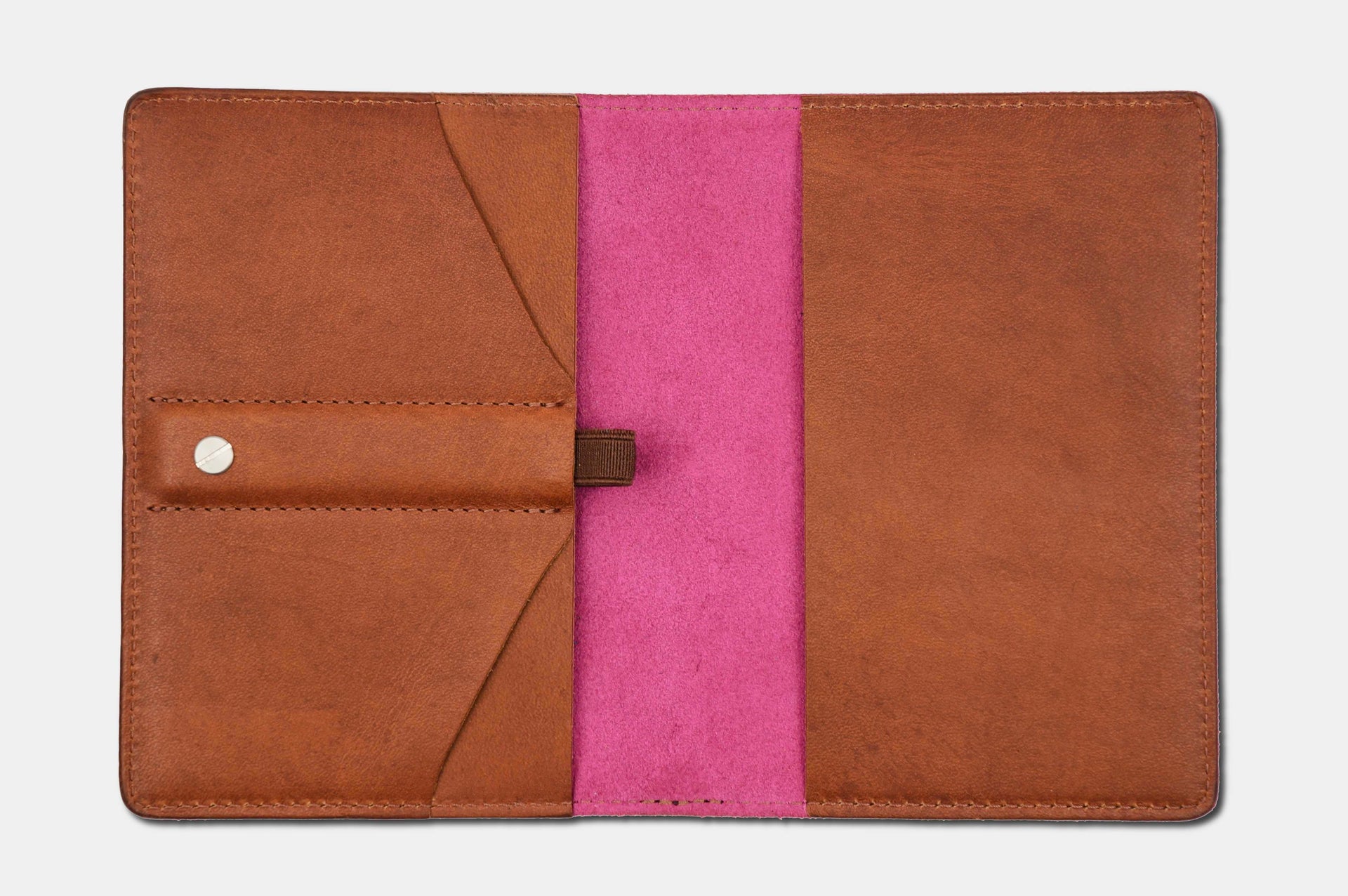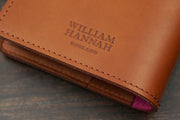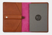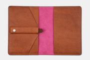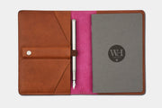 This is our Whiskey & Fuchsia cover, with space for a standard 90mm x 140mm (3½" × 5½") paper notebook, and it has two credit card/business card slots and a narrow front pocket. And since a notebook is only useful when you're carrying something to write with, we have incorporated a replaceable pen loop too.