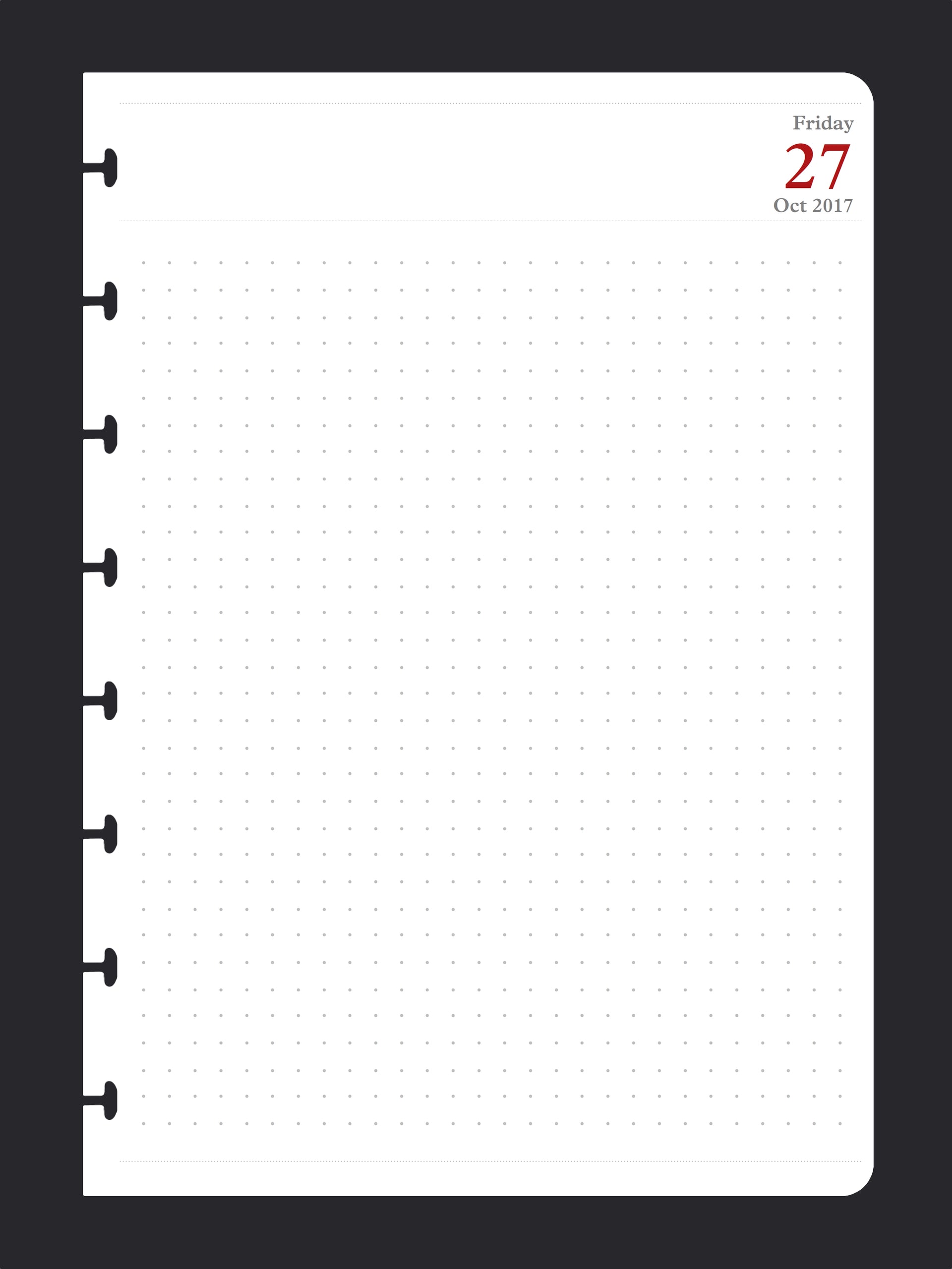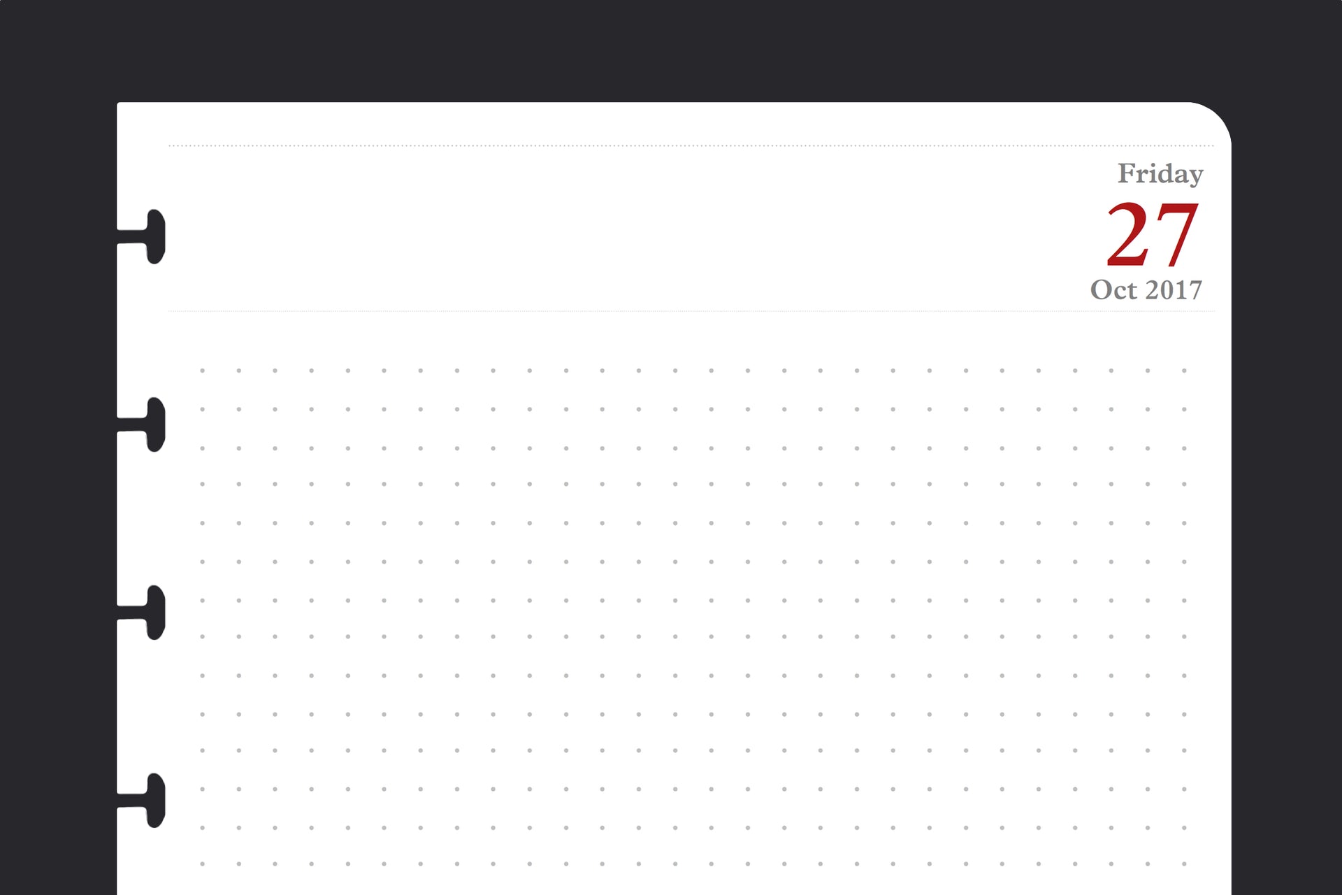 Designed to help you stay in control of your daily tasks, these ONE-day-to-a-page dated inserts have a blank section at the top for reminders of the day's meetings and goals, and the grey dot-grid section is great for listing the tasks that you need to do (or make notes about what you have already done !).
