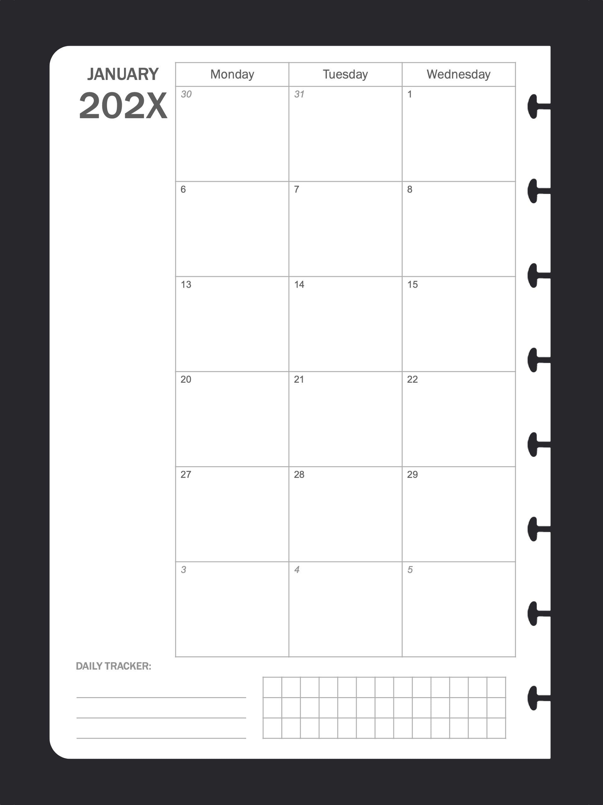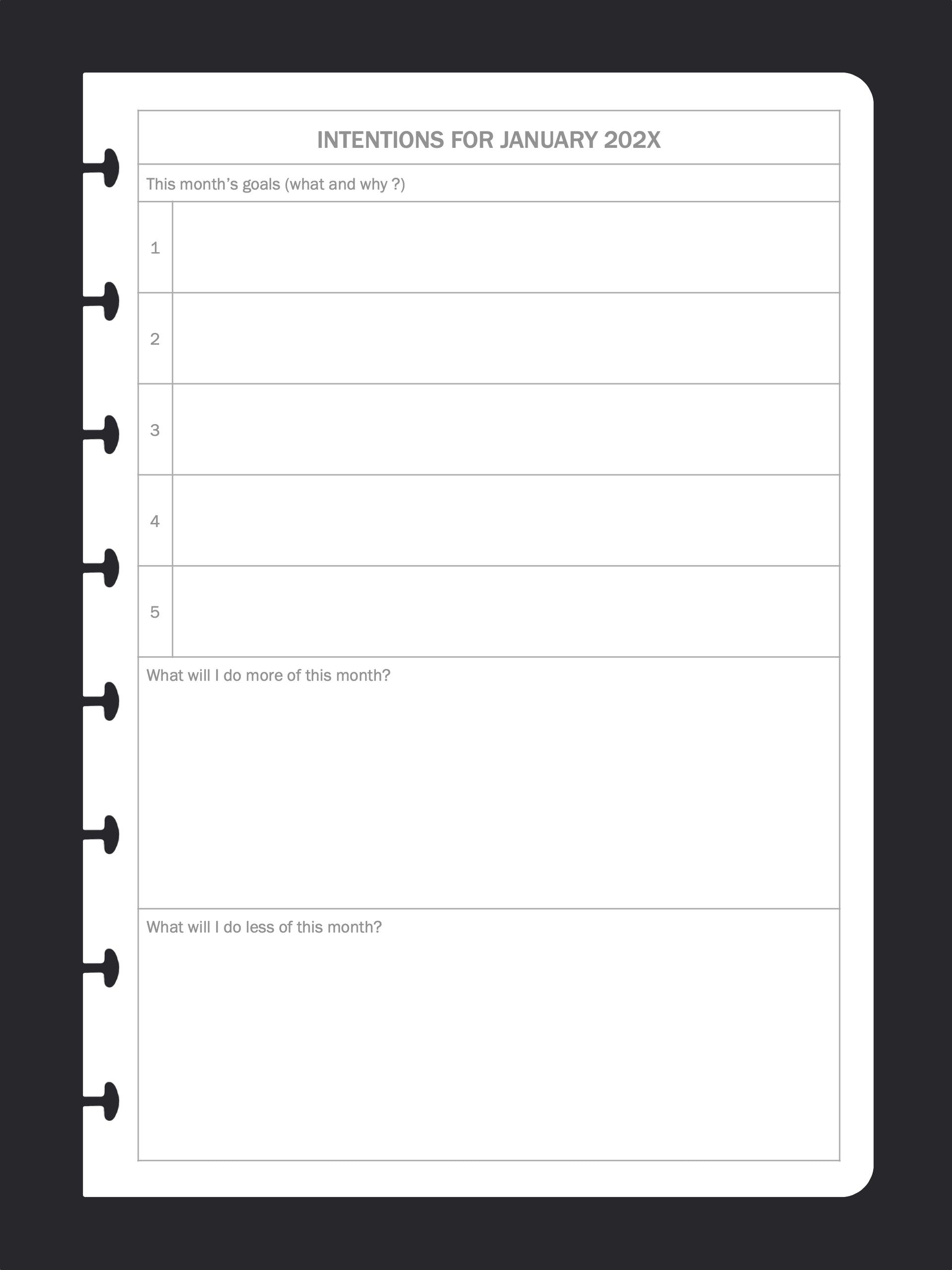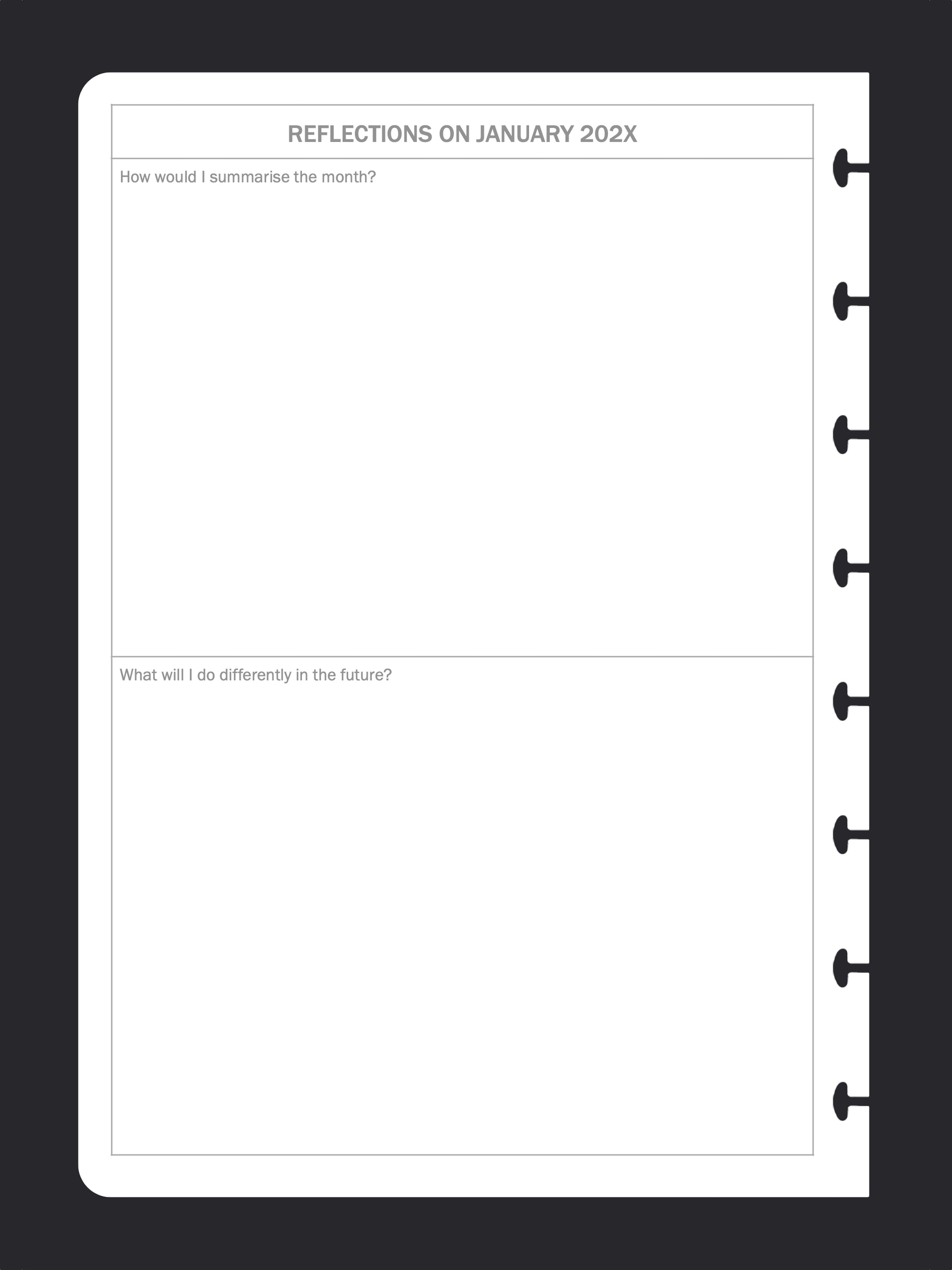 With exactly the same layout as our standard A5 Month to 2 Page Diary, this pack is geared towards a more intentional approach to monthly planning, with 2 extra pages each month designed to help you to record your goals and reflections.