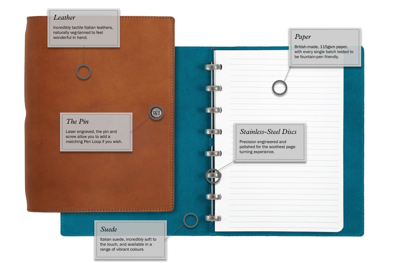 We considered many ways to hold and organise the pages in a William Hannah notebook, from the traditional level arch to the re-purposing of book- binding rivets. However, we took inspiration from a disc-binding method used for over 75 years, refining it and improving upon it to create the mechanism we use now.
