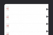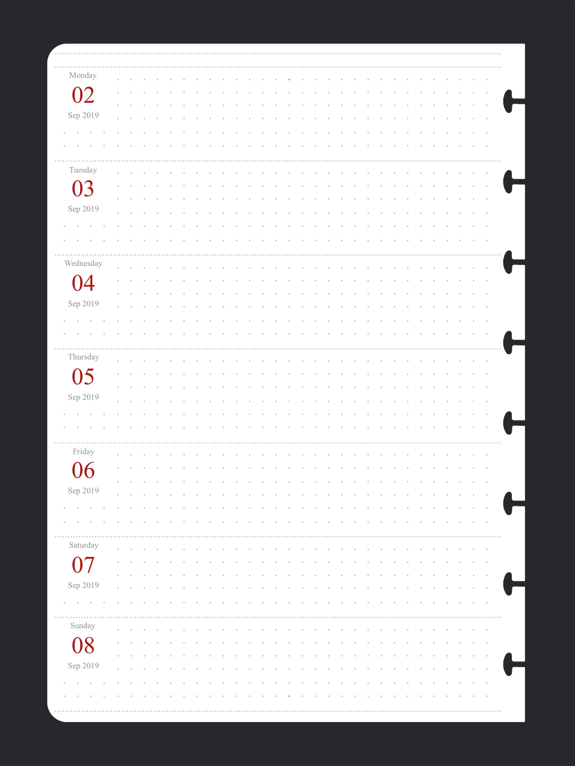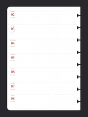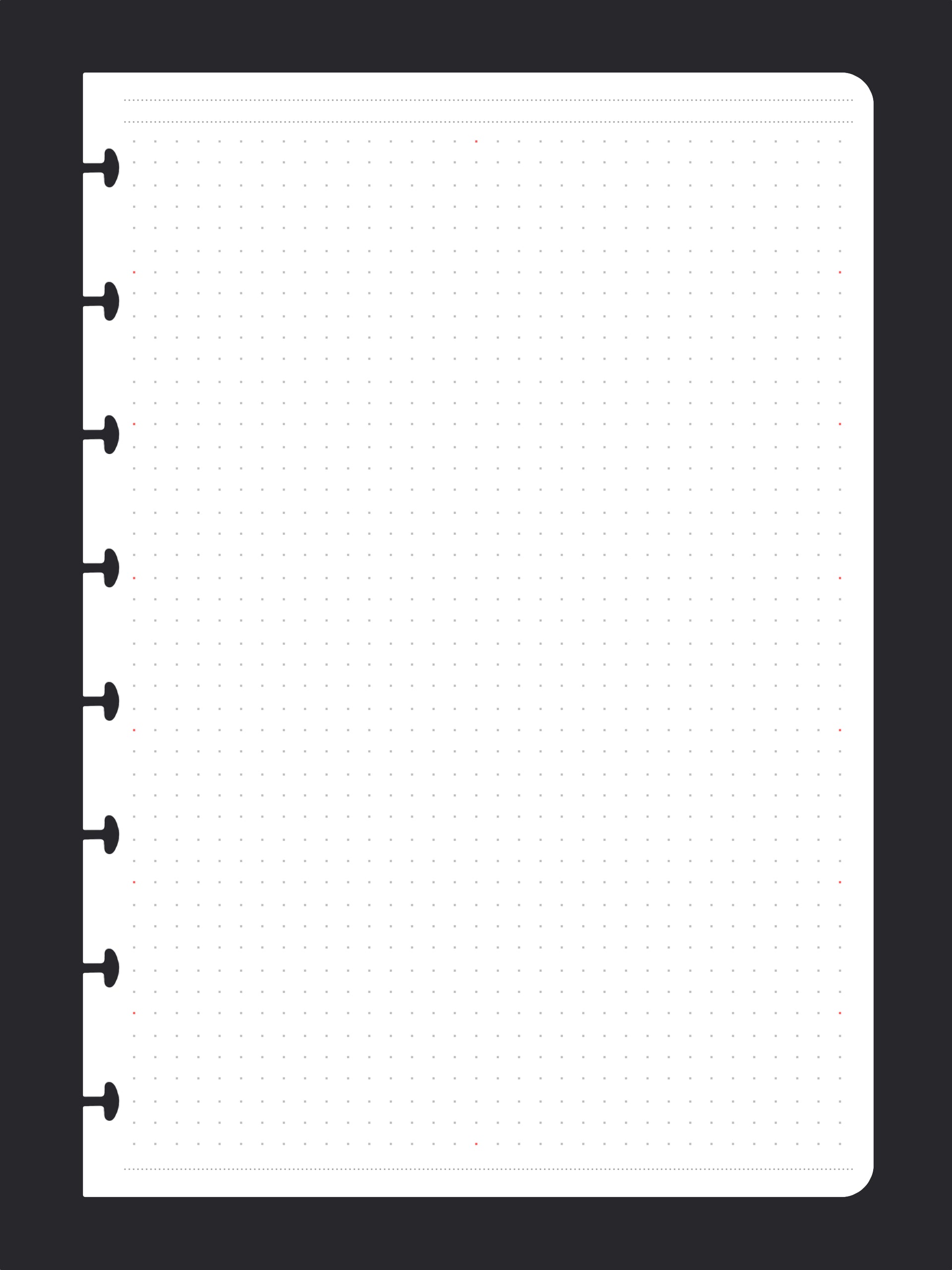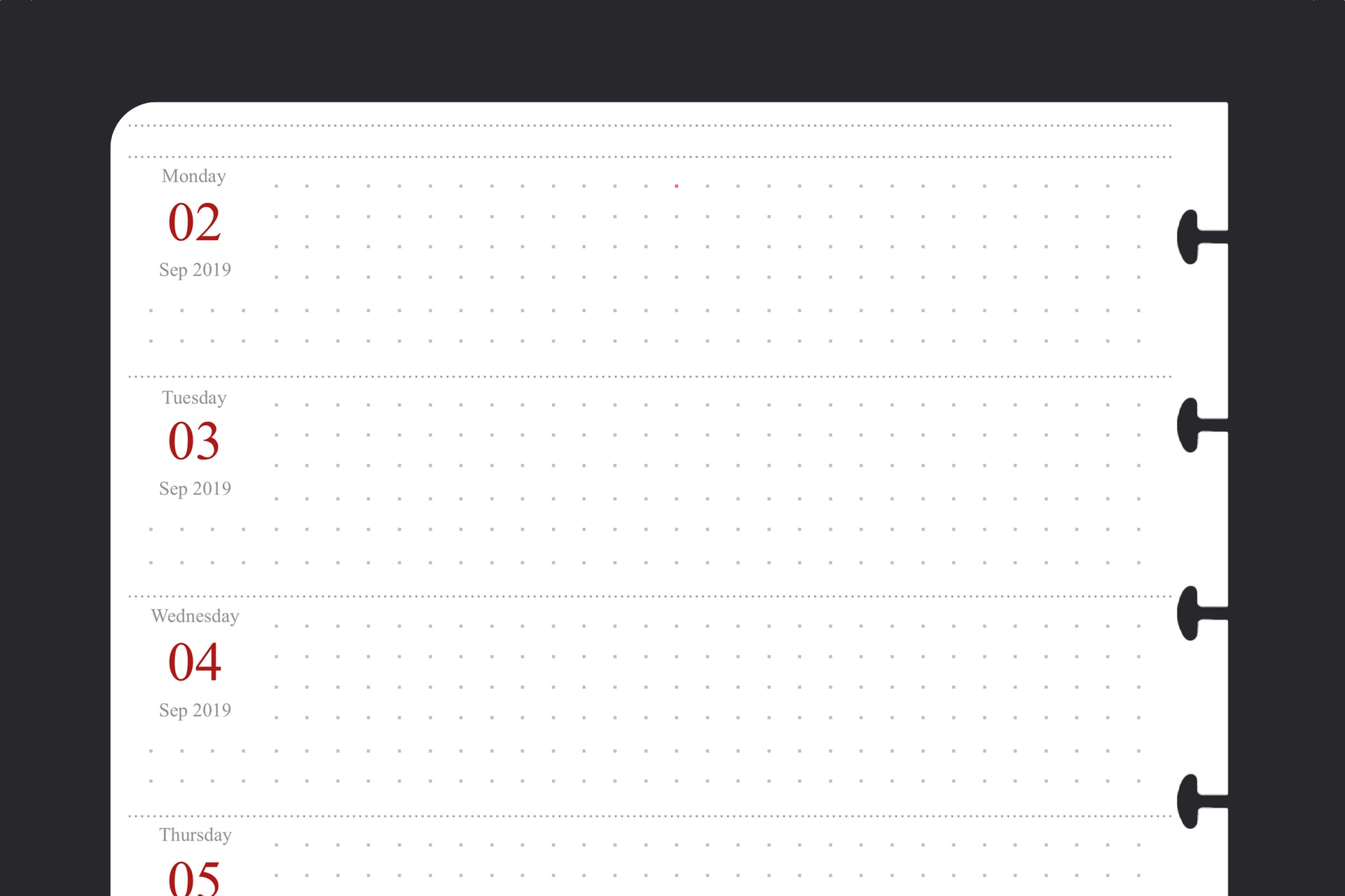 This pack uses a slightly smaller 4mm dot grid to maximise usefulness, and also has strategically placed single red dots to help you divide your dairy and/or notes, or even extend each day across the whole two-page spread.